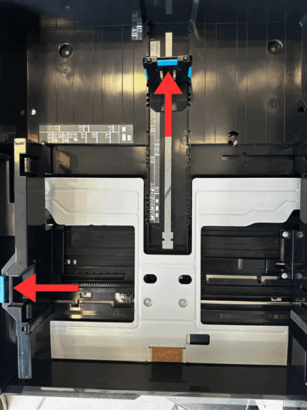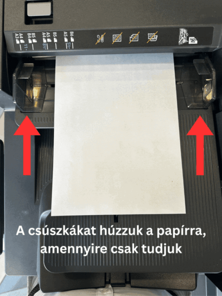 - Állítsd be a hossz- és szélességvezető csúszkákat a lap széléhez úgy, hogy finoman hozzáérjenek, de ne hajlítsák a papírt.